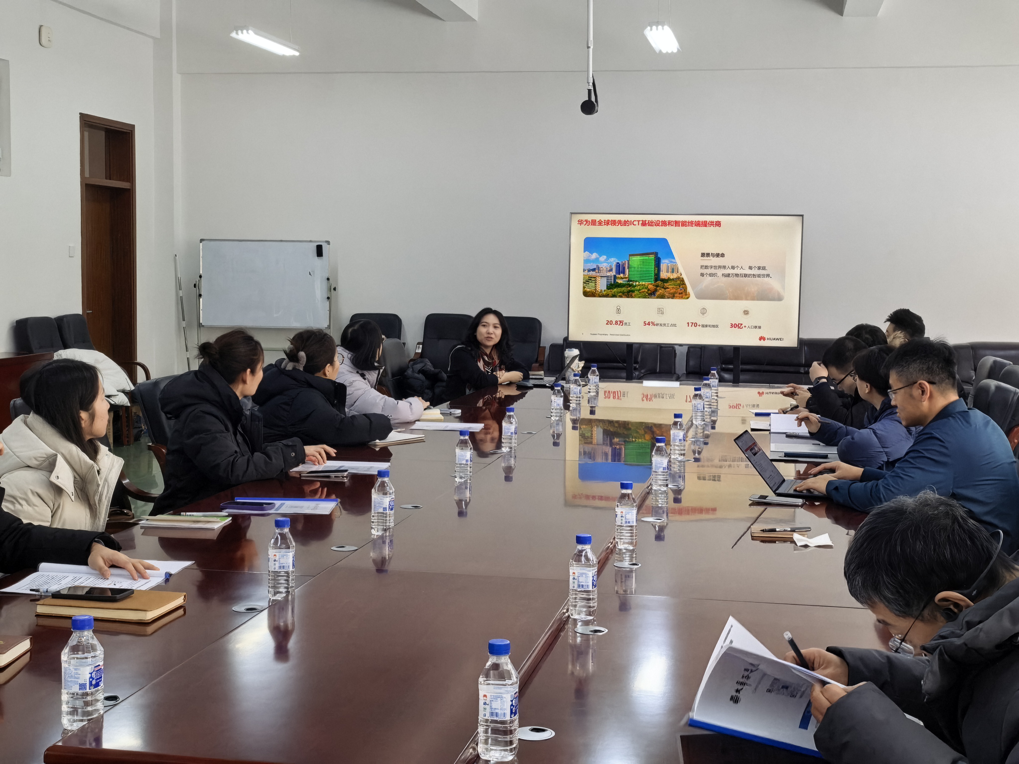 会议核心内容聚焦于华为推出的“难题揭榜”合作模式。夏主任系统阐释了该模式的意义与目的:通过发布产业实践中面临的真问题、硬骨头,旨在汇聚学术界智慧,共同攻关克难,同时在此过程中精准识别和发现具备创新潜力的人才。她详细介绍了揭榜项目的整体流程、评审机制及预期合作成果,并同步分享了华为在相关前沿领域的战略布局与技术构想,希望在研究方向高度契合的领域,与学院专家共同探索,扩大前沿理论的应用边界。